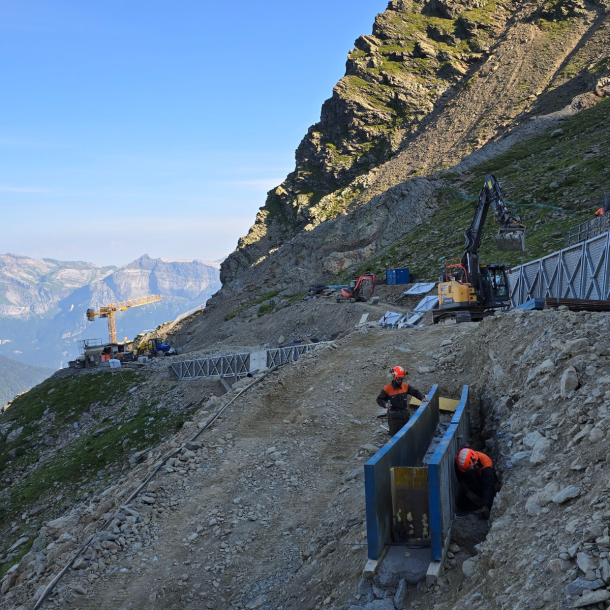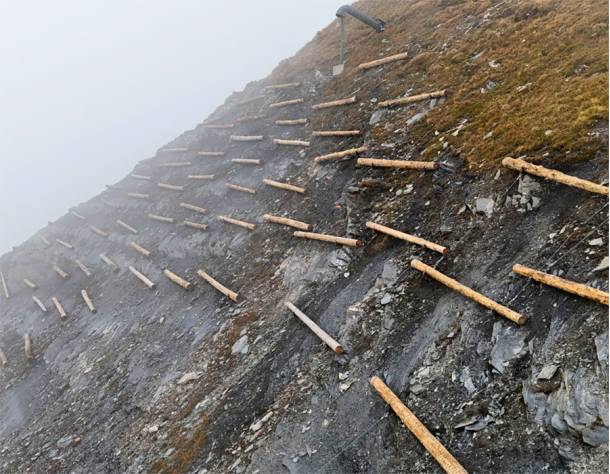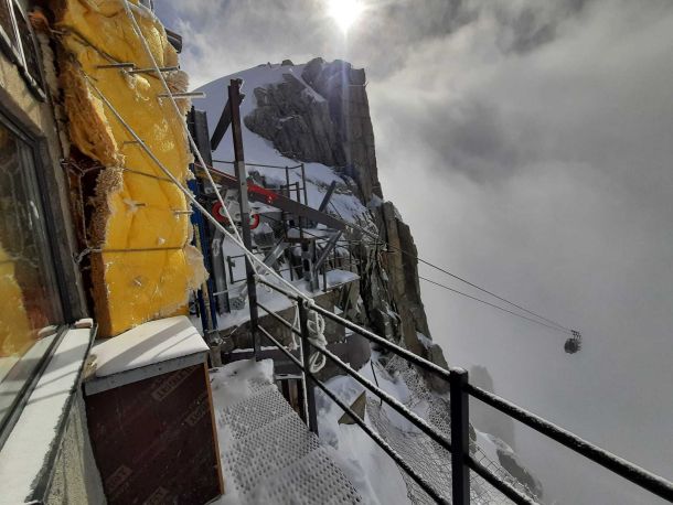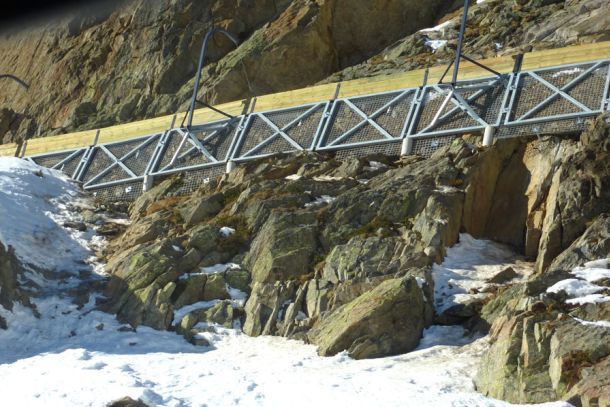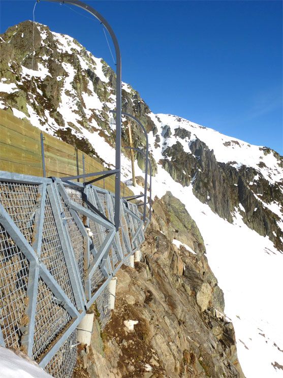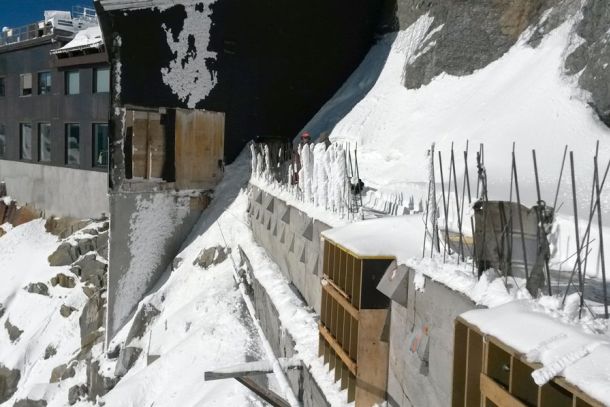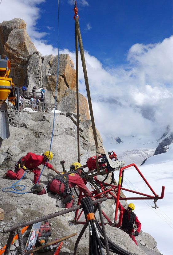 - Aiguille du Midi (Massif du Mont-Blanc) : confortement d’écailles rocheuses et pose de filets plaqués.